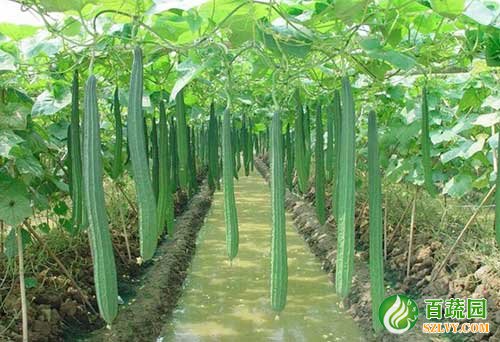 8、理瓜:開花結(jié)果期間,如幼瓜被棚架、葉片、蔓等阻礙不能自然下垂時容易變彎,因此要及時進行理瓜,使之垂直懸掛于棚架內(nèi),提高絲瓜的商品性。