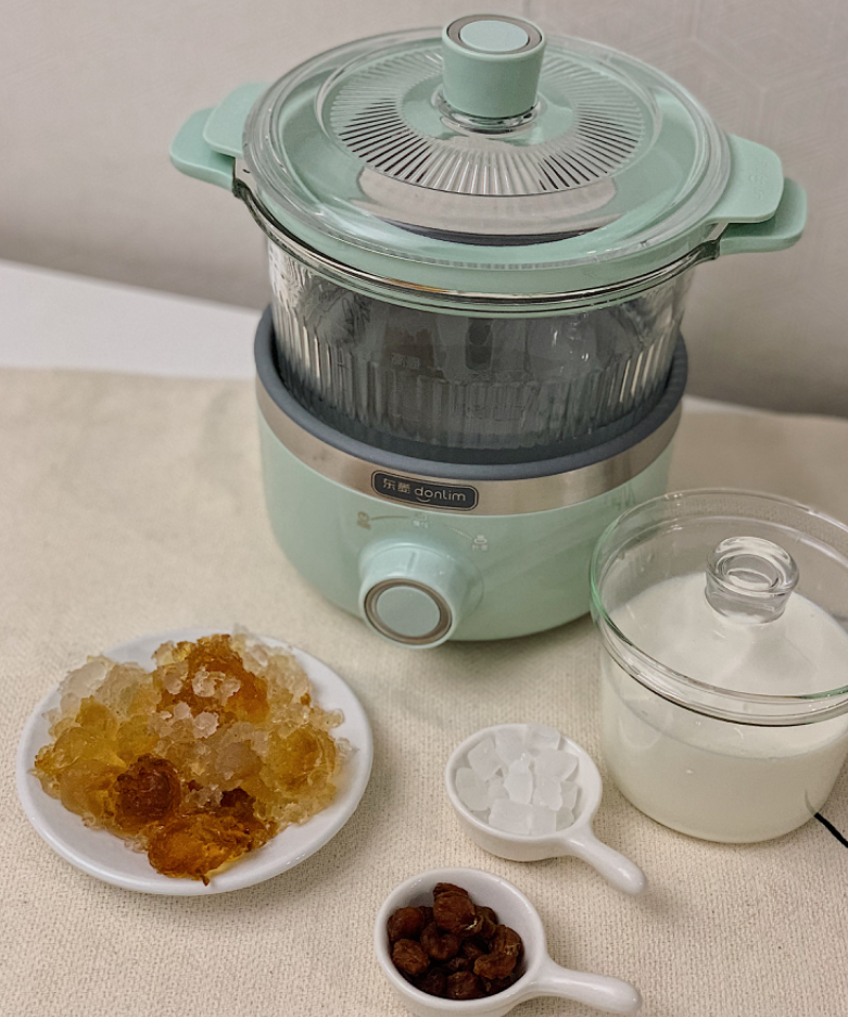 第一步,將桃膠提前泡發(fā)12小時(shí),準(zhǔn)備牛奶、桂圓、冰糖、玫瑰花瓣等食材。取適量水加入東菱養(yǎng)生鍋2.5L的燉煮鍋中,再將泡發(fā)好的桃膠連同桂圓、牛奶等一起放到東菱養(yǎng)生鍋配備的0.5L小燉盅里,將燉盅放入燉煮鍋內(nèi)進(jìn)行隔水燉。東菱養(yǎng)生鍋采用燉煮鍋和小燉盅雙容量搭配,各種燉品、料理都能做,分量好把控,非常nice!